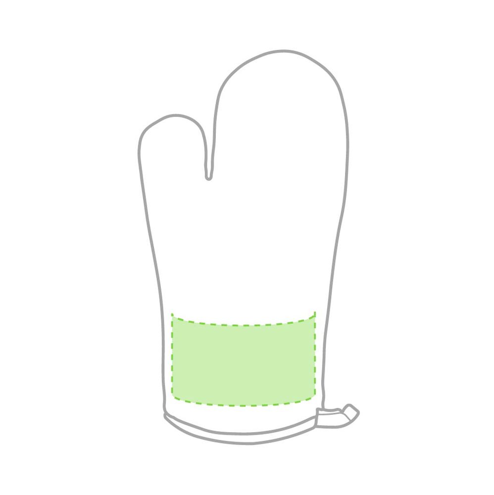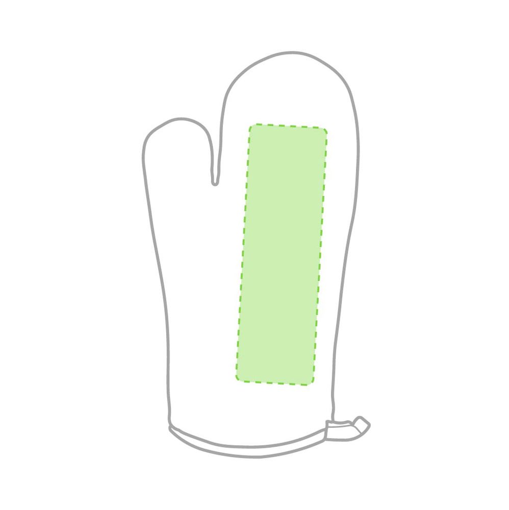 Küchenhandschuh aus weichem 100 % Polyester in Weiß mit Rändern in kräftigen Farben. Mit Schlaufe zum Aufhängen und einer glatten Seite - speziell für den Sublimationsdruck entwickelt.
