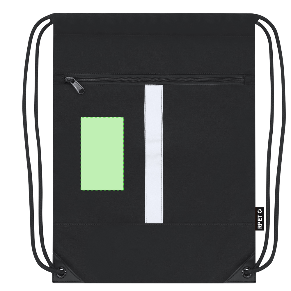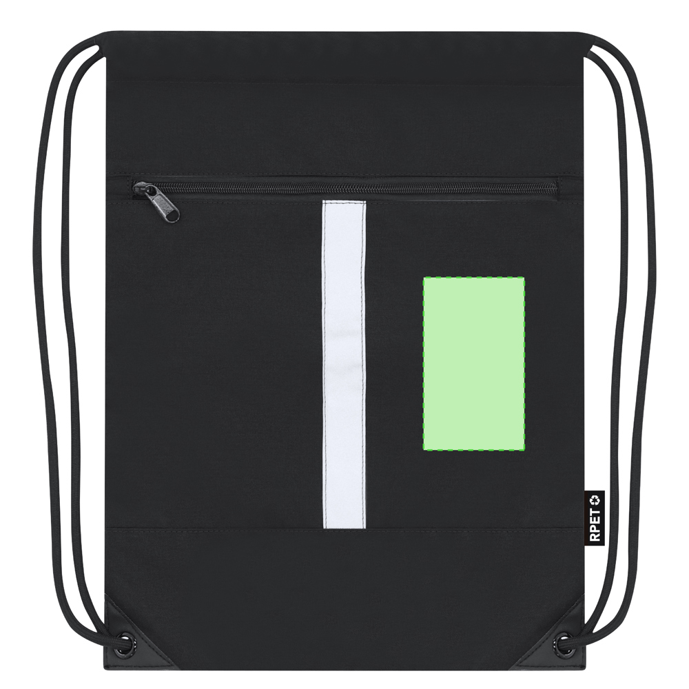 Reflektierender Rucksack aus 300 RPET Polyester mit reflektierendem Frontstreifen. Es hat vorne eine Tasche. Selbstschließende Seile in schwarzer Farbe und Ecken, verstärkt mit Metallringen.